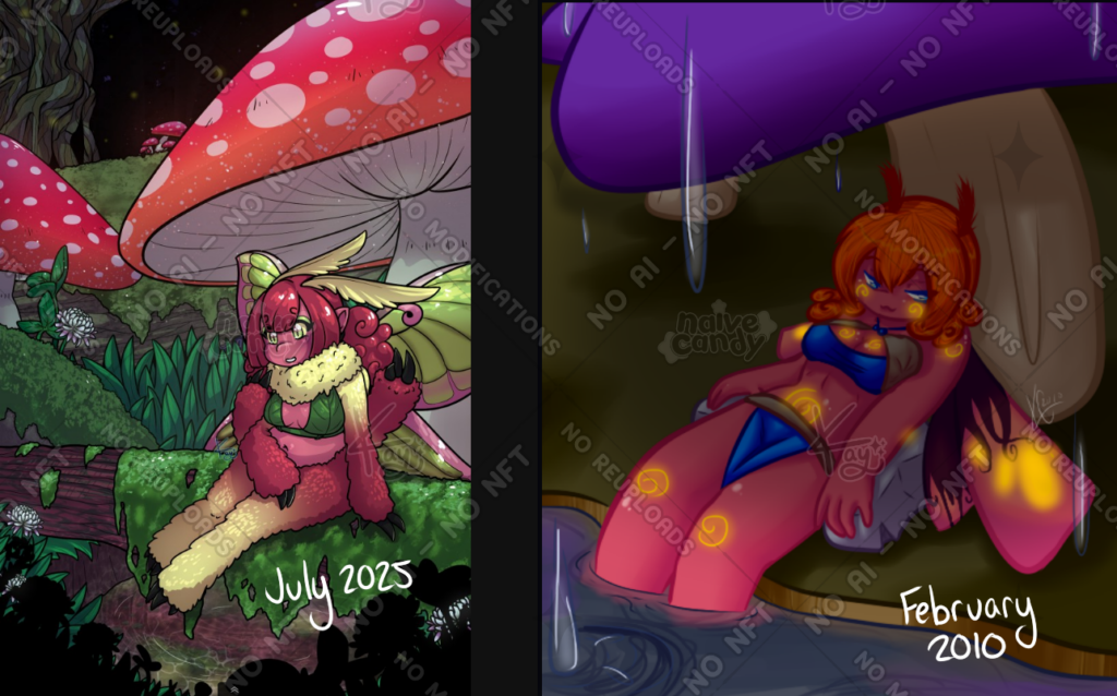 Two images placed side by side. On the left is the image from the original post with “July 2025” written on it. On the right is the February 2010 version of this artwork, with an outdated version of the same character leaning back on a small rock with purple mushrooms and her legs in a puddle with rain.