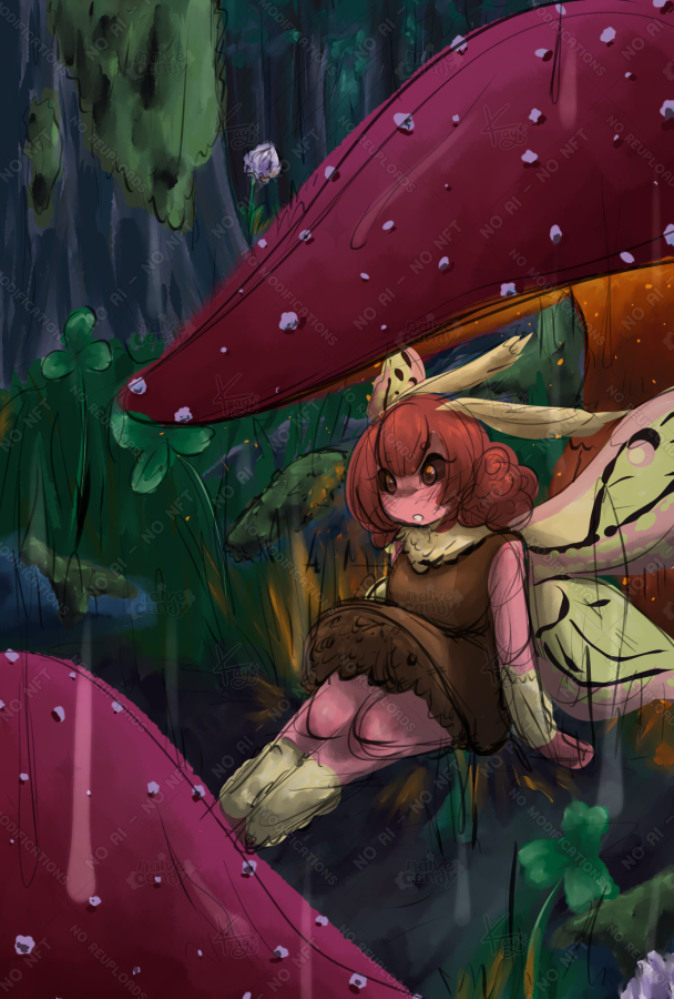 [Image ID: An illustration of a moth girl character sitting on a mossy stick over a small hole in the ground filled with water. There are red mushrooms and a forested scene behind her. The moth girl has thick fluff around her neck, four fluffy arms, two fluffy legs, and a normal set of moth wings with fluffy antennae. She has two puffy, curly pigtails, but straight cut bangs that frame her face. She is wearing a top that seems like a bikini top, made out of leaves and vines. The character is based on a hybrid Chinese Moon Moth and Spanish Moon Moth. /.End ID]